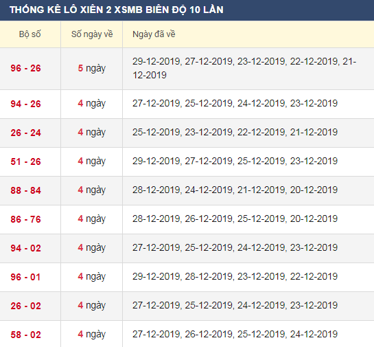 Thống kê lô xiên 2 XSMB trong 30 lần quay gần đây