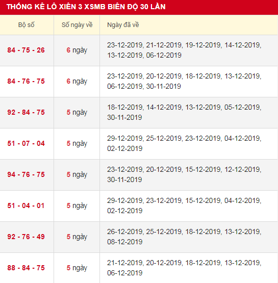 Bảng dự đoán xổ số miền Bắc lô xiên 3 ngày 30/12/2019