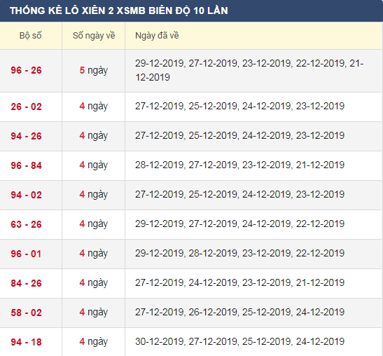 Thống kê lô xiên 2 XSMB trong 30 lần quay gần đây