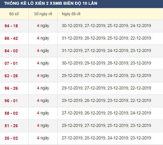 Thống kê lô xiên 2 XSMB trong 30 lần quay gần đây
