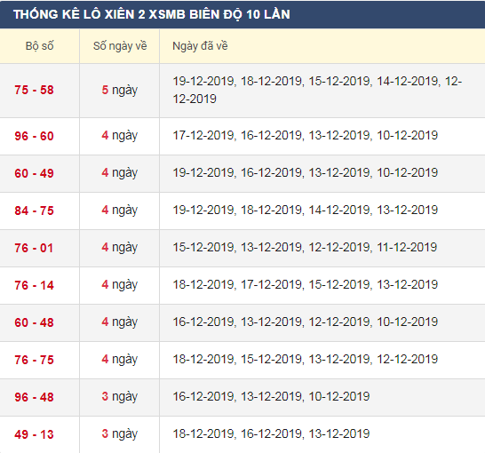 Bảng dự đoán xổ số miền Bắc lô xiên 2 ngày 20/12/2019