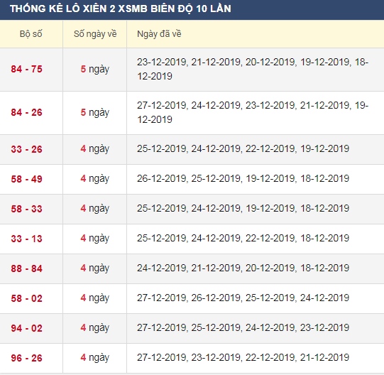 Thống kê lô xiên 2 XSMB trong 30 lần quay gần đây