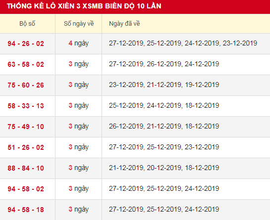 Thống kê lô xiên 3 XSMB trong 30 lần quay gần đây