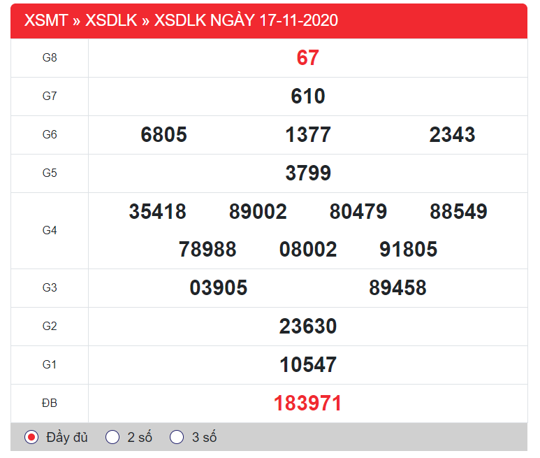 Trước khi đi vào chi tiết phần dự đoán XSDLK 24/11/2020, mời anh em cùng nhìn lại bảng kết quả XSDLK thứ 3 tuần trước ngày 17/11/2020