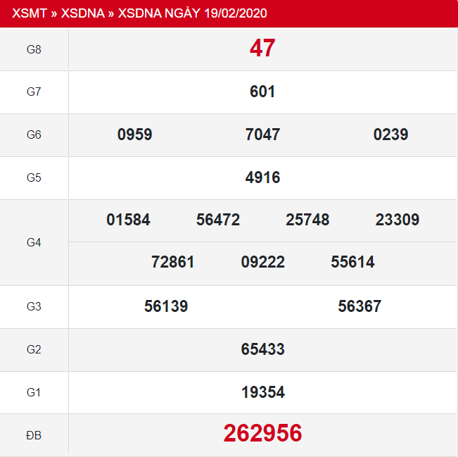 Trước khi đi vào chi tiết phần dự đoán XSDNA 22/2/2020, mời anh em cùng nhìn lại bảng kết quả XSDNA thứ 7 tuần trước ngày 19/2/2020