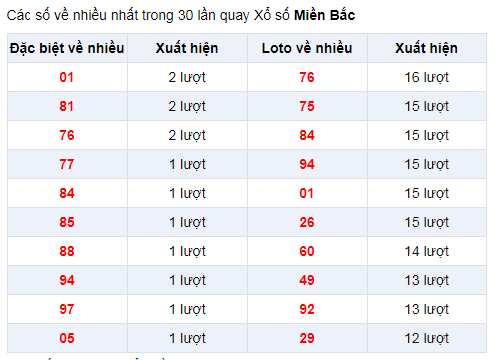 Thống kê bảng đặc biệt XSMB