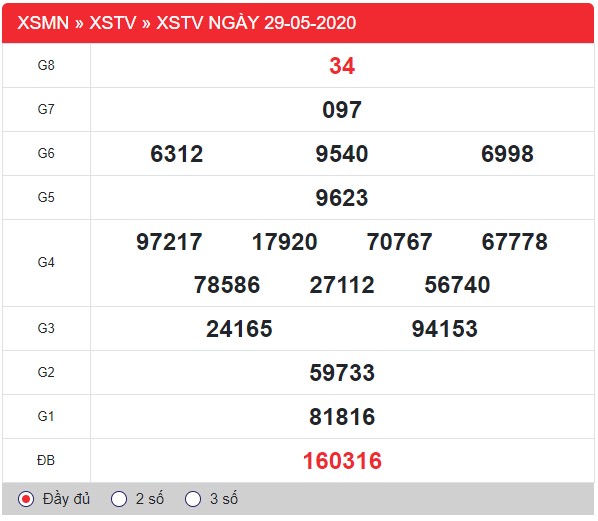Các kết quả mà ngày trước đó cũng có loto đặc biệt 29Trước khi đi vào chi tiết phần dự đoán XSTV 5/6/2020, mời anh em cùng nhìn lại bảng kết quả XSTV thứ 6 tuần trước ngày 29/5/2020