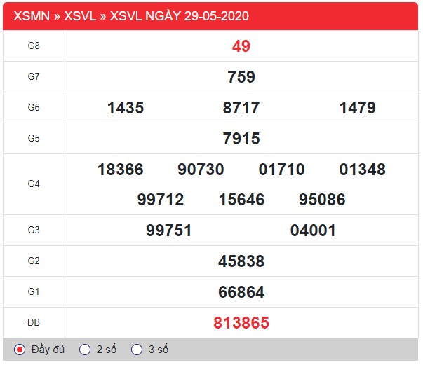 Trong lần quay thưởng xổ số đài Vĩnh Long thứ 6 ngày 29/5/2020, giải đặc biệt đã thuộc về khách hàng sở hữu tấm vé số vô cùng may mắn 813865, giải nhất thuộc về khách hàng có tấm vé số trùng khớp với dãy số 66864 và giải nhì thuộc về khách hàng có tấm vé may mắn trùng với dãy số 45838