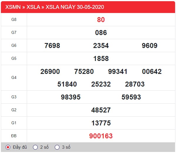 Trước khi đi vào chi tiết phần dự đoán XSLA 6/6/2020, mời anh em cùng nhìn lại bảng kết quả XSLA thứ 7 tuần trước ngày 30/5/2020