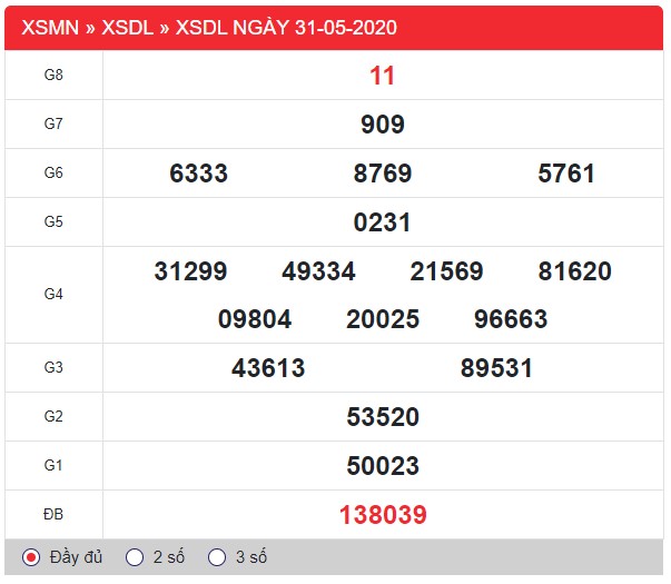 Trước khi đi vào chi tiết phần dự đoán XSDL 7/6/2020, mời anh em cùng nhìn lại bảng kết quả XSDL chủ nhật tuần trước ngày 31/5/2020