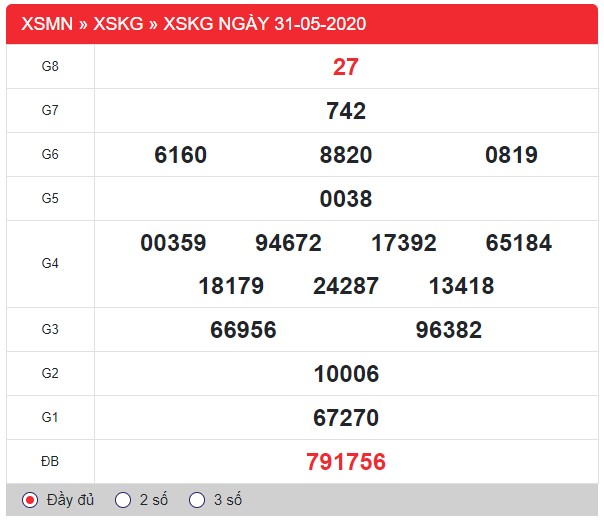 Trước khi đi vào chi tiết phần dự đoán XSKG 7/6/2020, mời anh em cùng nhìn lại bảng kết quả XSKG chủ nhật tuần trước ngày 31/5/2020