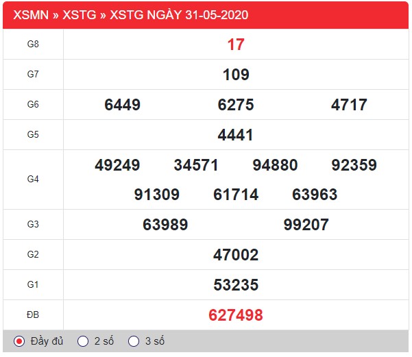 Trước khi đi vào chi tiết phần dự đoán XSTG 7/6/2020, mời anh em cùng nhìn lại bảng kết quả XSTG chủ nhật tuần trước ngày 31/5/2020
