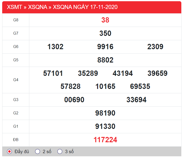 Trước khi đi vào chi tiết phần dự đoán XSQNA 24/11/2020, mời anh em cùng nhìn lại bảng kết quả XSQNA thứ 3 tuần trước ngày 17/11/2020