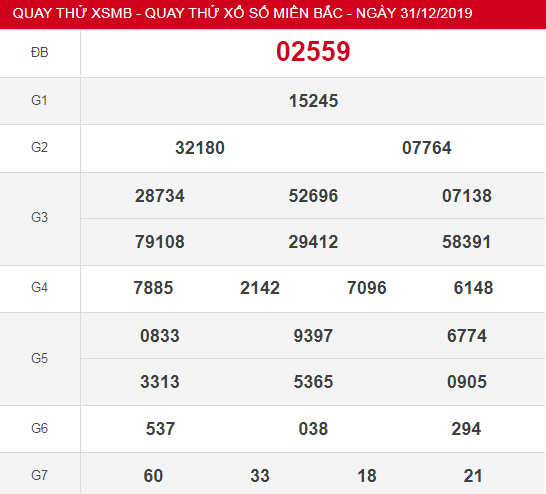 Quay thử XSMB 31/12 – Công cụ quay thử kết quả xổ số miền Bắc thứ 3 ngày 31/12/2019 được thực hiện bằng máy tính mang lại các con số may mắn giúp anh em dễ dàng lựa chọn và nắm chắc vận may trong ngày hôm nay. Xổ số miền Bắc thứ 3 được quay thưởng tại tỉnh Quảng Ninh vào lúc 18h15′ hàng tuần.