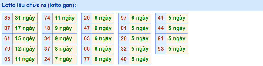 • Cặp số 85 đã 31 ngày chưa ra, cực đại là 25 ngày (từ 13/02/2014 đến 09/03/2014)