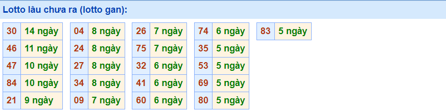 - Cặp số 30 đã 14 ngày chưa ra, cực đại là 29 ngày (từ 07/09/2015 đến 05/10/2015)