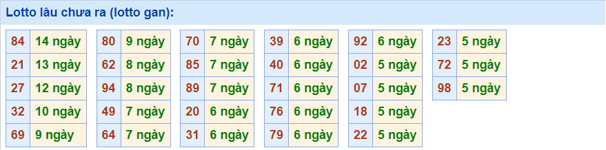 • Cặp số 84 đã 14 ngày chưa ra, cực đại là 29 ngày (từ 29/05/2014 đến 26/06/2014)