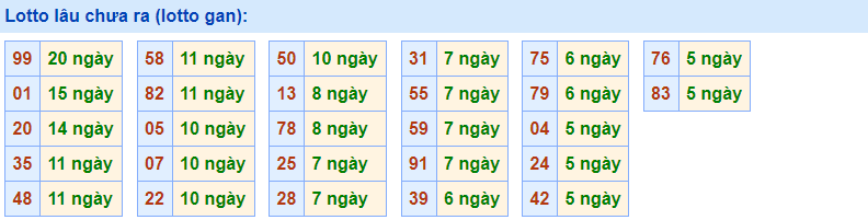 - Cặp số 99 đã 20 ngày chưa ra, cực đại là 20 ngày (từ 25/05/2017 đến 13/06/2017)