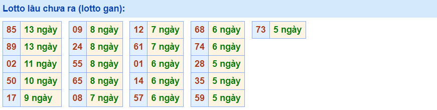 - Cặp số 85 đã 13 ngày chưa ra, cực đại là 25 ngày (từ 13/02/2014 đến 09/03/2014)