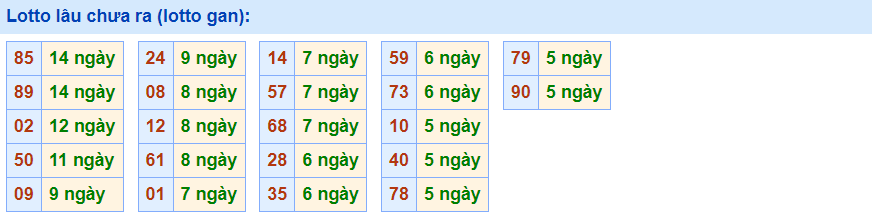 - Cặp số 85 đã 14 ngày chưa ra, cực đại là 25 ngày (từ 13/02/2014 đến 09/03/2014)