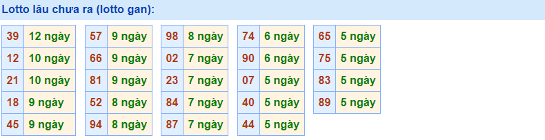 • Cặp số 39 đã 12 ngày chưa ra, cực đại là 38 ngày (từ 14/06/2014 đến 21/07/2014)