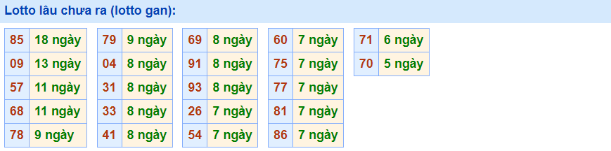 • Cặp số 85 đã 18 ngày chưa ra, cực đại là 25 ngày (từ 13/02/2014 đến 09/03/2014)