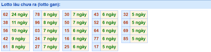 - Cặp số 62 đã 24 ngày chưa ra, cực đại là 28 ngày (từ 25/07/2017 đến 21/08/2017)