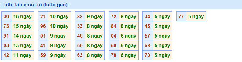 - Cặp số 30 đã 15 ngày chưa ra, cực đại là 29 ngày (từ 07/09/2015 đến 05/10/2015)