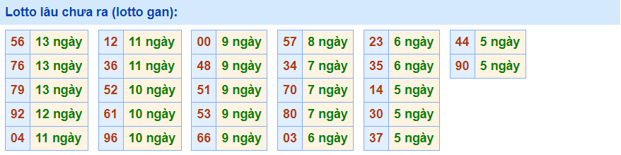 - Cặp số 56 đã 13 ngày chưa ra, cực đại là 23 ngày (từ 17/12/2020 đến 08/01/2021)