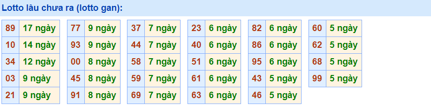 • Cặp số 89 đã 17 ngày chưa ra, cực đại là 31 ngày (từ 08/07/2009 đến 07/08/2009)