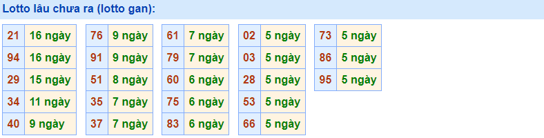 • Cặp số 21 đã 16 ngày chưa ra, cực đại là 28 ngày (từ 07/05/2016 đến 03/06/2016)