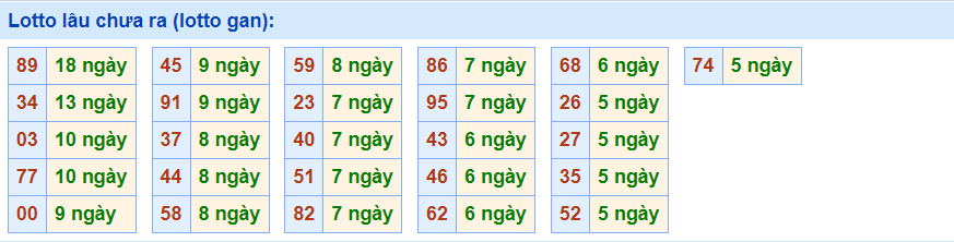 - Cặp số 89 đã 18 ngày chưa ra, cực đại là 31 ngày (từ 08/07/2009 đến 07/08/2009)