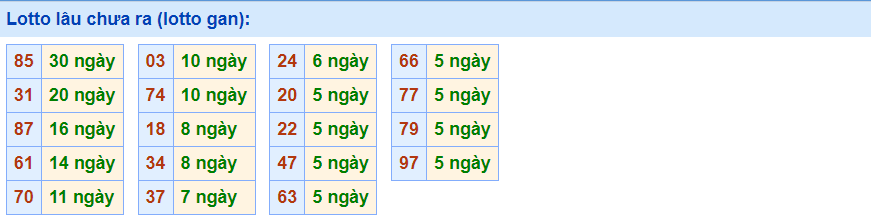 • Cặp số 85 đã 30 ngày chưa ra, cực đại là 25 ngày (từ 13/02/2014 đến 09/03/2014)