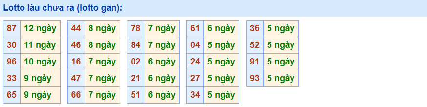 - Cặp số đã 12 ngày chưa ra, cực đại là 23 ngày (từ 29/09/2014 đến 21/10/2014)