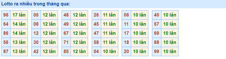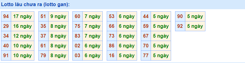 - Cặp số 94 đã 17 ngày chưa ra, cực đại là 32 ngày (từ 04/07/2011 đến 04/08/2011)