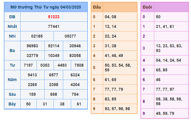 + Cầu Đặc biệt đẹp nhất  thứ 5 ngày 5/3/2020: 27,72 – 28,82 – 02,20 – 29,92 – 47,74 – 79,97 – 78,87 – 48,84 – 04,40 – 49,94