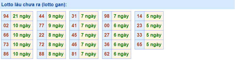 - Cặp số 94 đã 21 ngày chưa ra, cực đại là 32 ngày (từ 04/07/2011 đến 04/08/2011)