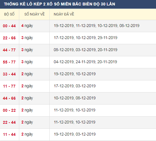 Bảng thống kê lô ké XSMB 30 lần quay gần đây