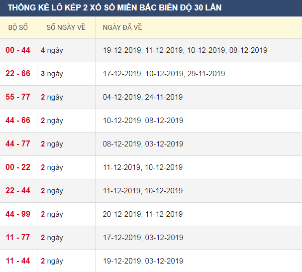 Thống kê lô kép XSMB 23/12/2019
