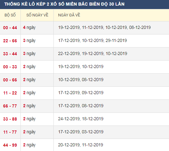 Thống kê lô kép XSMB 27/12/2019