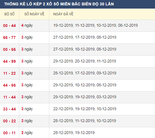 Thống kê lô kép XSMB 31/12/2019